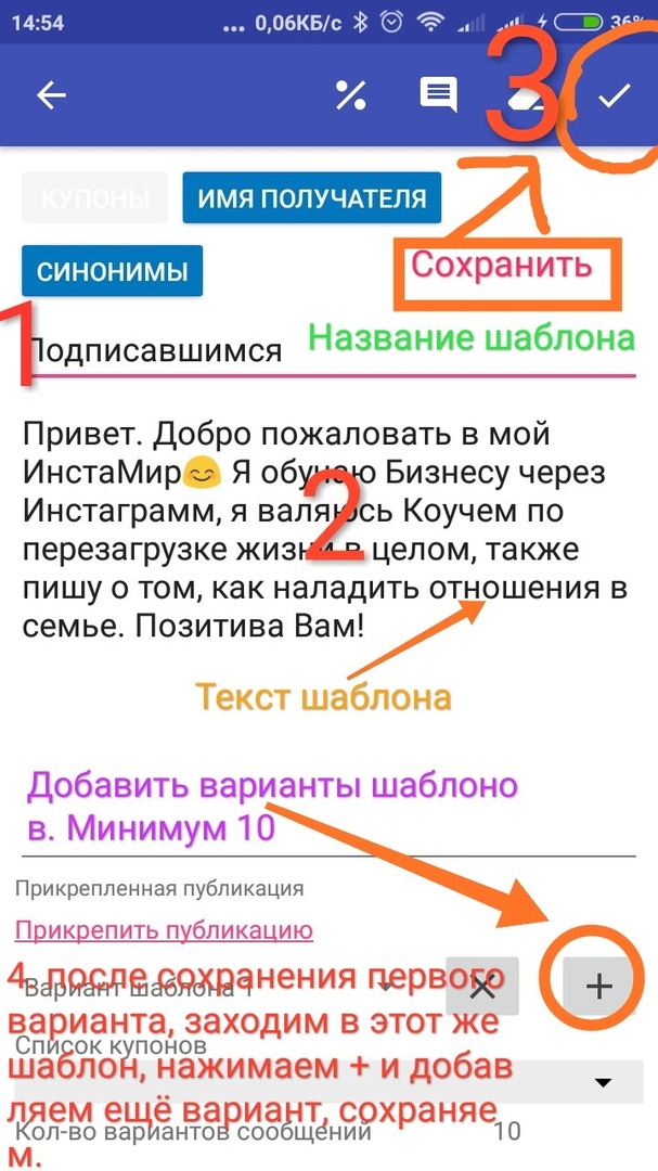 Еще раз по рассылке. Заходим в неё, нажимаем сверху на лист, пишем название шаблона, пишем текст шаблона, нажимаем СОКРАНИТЬ -галочка справа наверху. Потом возвращаемся в ЭТОТ же шаблон- РЕДАКТИРОВАТь, нажимаем ВНИЗУ + плюсик и добавляем следующий ВАРИАНТ этого шаблона, СОХРАНЯЕМ. И так пока не внесём нужное число разных вариантов шаблона.